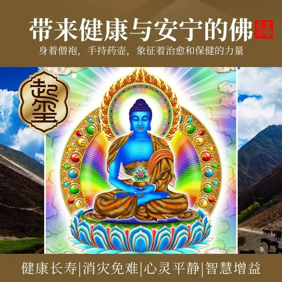 消灾解难,延年益寿 莲花生大士,见者增福! 莲花生大士为三世诸佛的总集化现, 他即生成就了不灭虹化身, 亲身示现不生不灭之真