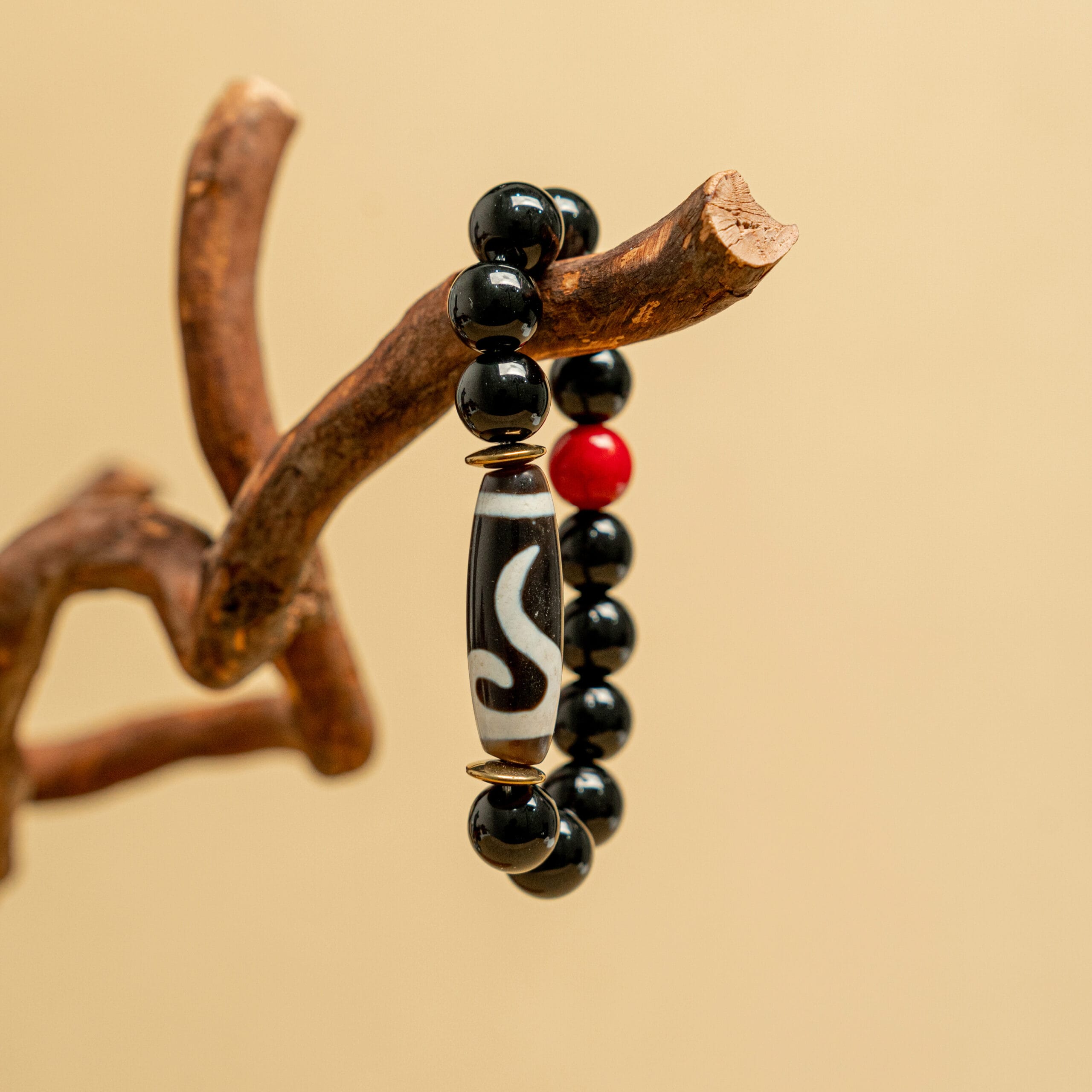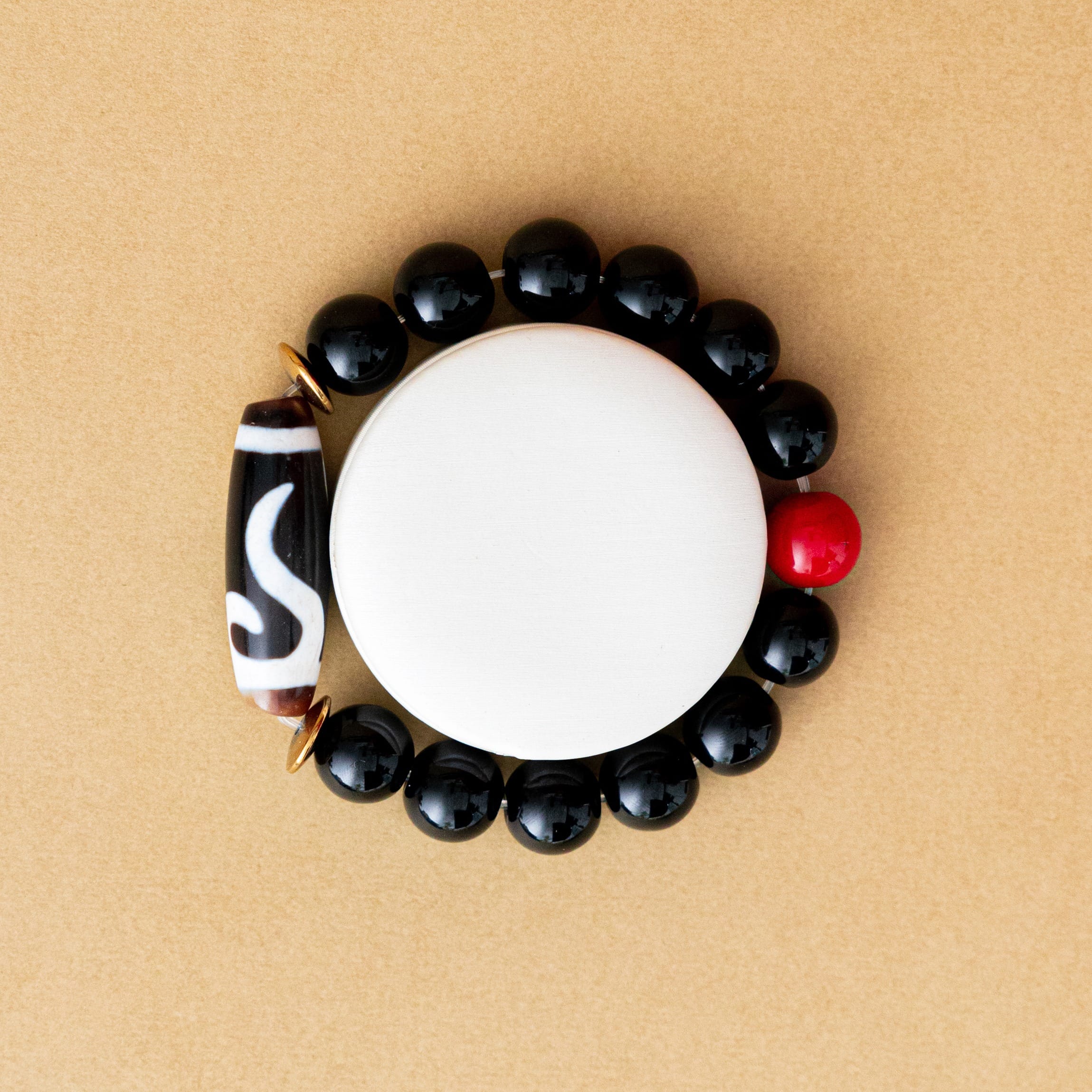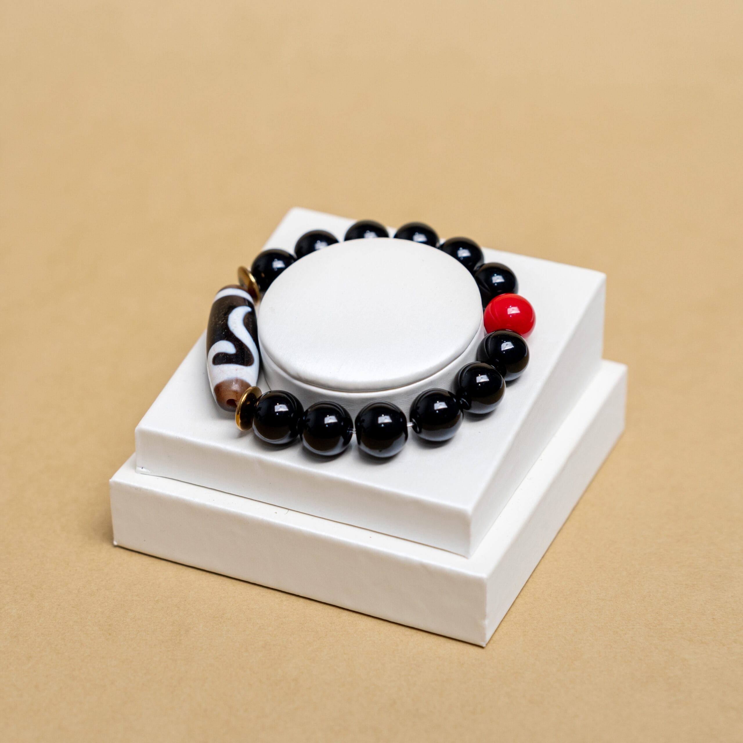 玛哈嘎拉,为本尊加持,象征护持与能量转换,朱砂质地承载镇定护法之力,天珠纹理彰显岁月沉淀的清净能量,使整体更趋稳固、护持与觉醒并行。贵人图腾寓意护持与力量,提醒持有者在挑战中得力,化危为机。