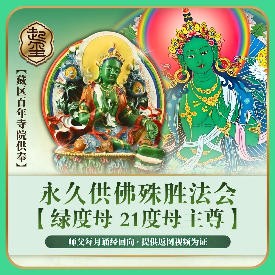 绿度母为观世音菩萨慈悲泪珠所化现,二十一度母之主。据《度母本源记》载,观世音菩萨见众生苦难,悲心泪涌,左泪化现白度母,右泪化现绿度母,同发誓愿救度众生。